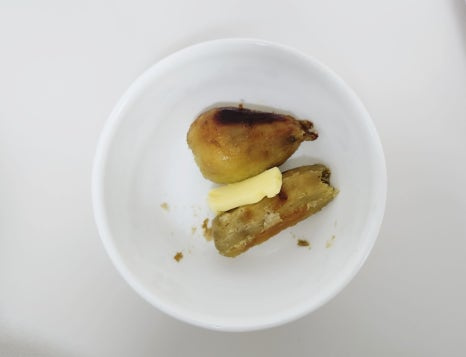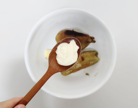 따뜻하게 익힌 고구마는 껍질을 벗겨 큰 볼에 담습니다. 뜨거운 상태에서 버터 10g을 넣어 주세요. 그래야 버터가 자연스럽게 잘 녹아요.