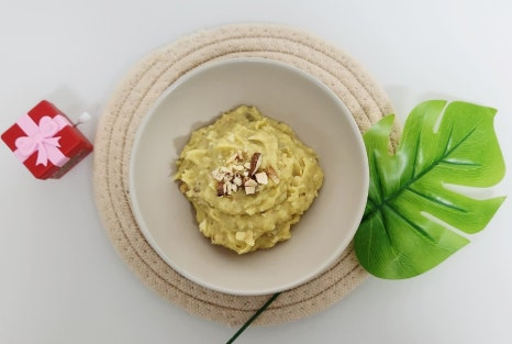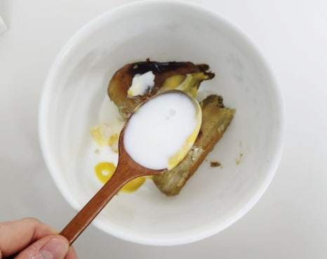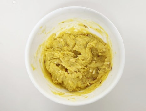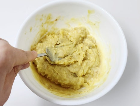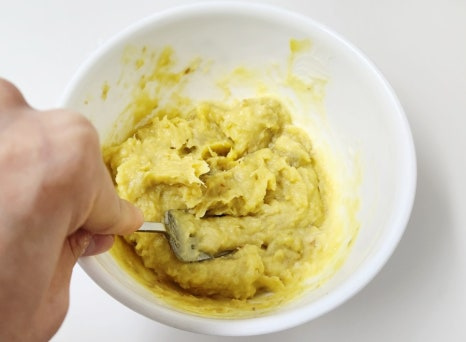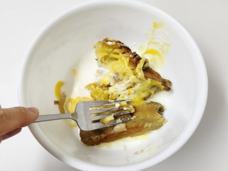 그리고 포크나 매셔로 고구마를 곱게 으깨 주세요. 덩어리가 남지 않도록 부드럽게 만드는 것이 중요해요.