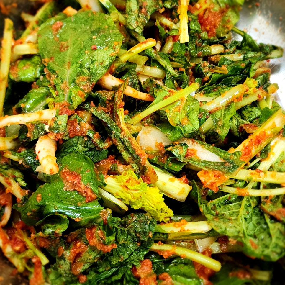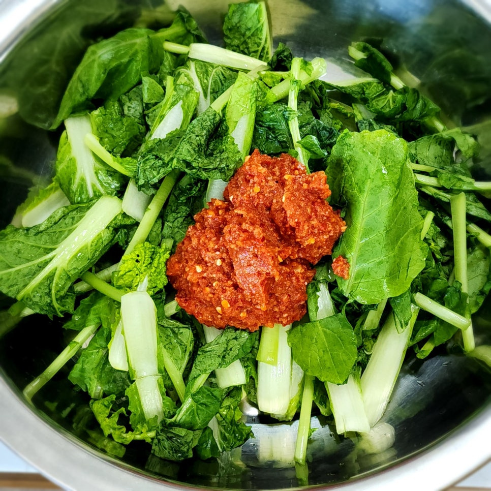 물기를 빼놓은 열무와 얼갈이배추에 만들어 놓은 양념을 넣어 사알~살 버무려 주세요