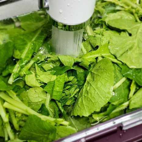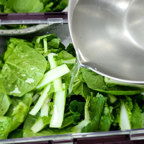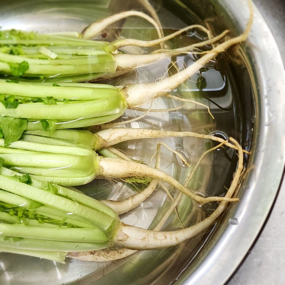 손질한 열무와 얼갈이배추는 차가운 물에서 헹궈주시면 되는데요 여기서 주의하실 점은 열무와 얼갈이배추는 풋내가 날 수 있으니 씻을 때 마구 휘젓거나 뒤척이면 안된답니다 잎이나 줄기에 상처가 나지 않게 살살 흔들거나 위아래 뒤집어가며 씻어 주세요 그리고 채반에 밭쳐 물기를 빼 주세요