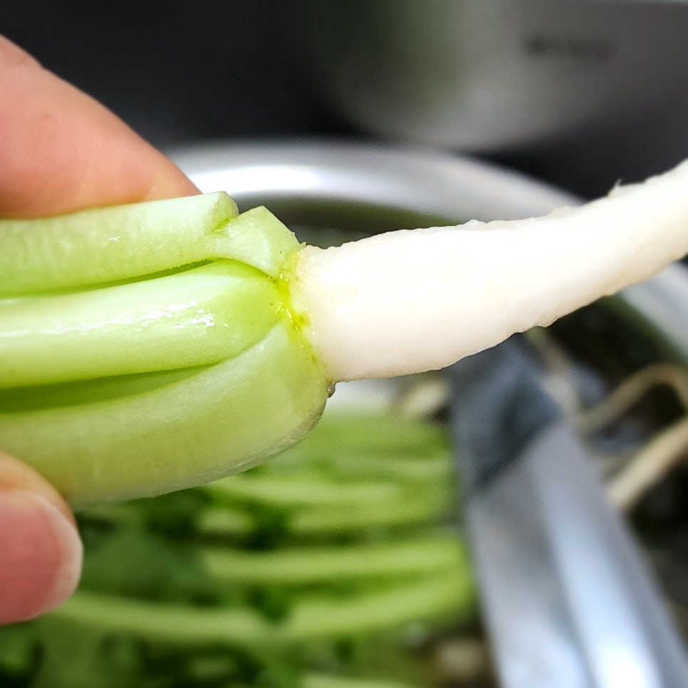 무의 흙을 긁고 깍지를 제거했다면 잔뿌리가 많은 끄트머리는 잘라내고 무와 줄기를 구분해서 자릅니다 만약 무가 좀 크다면 세로로 반 갈라주시는 것이 먹기에 더 편하답니다