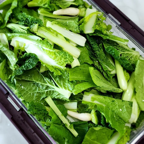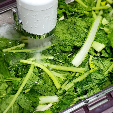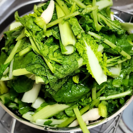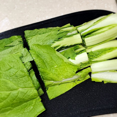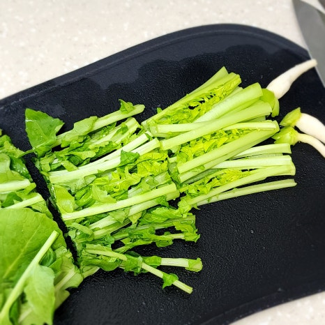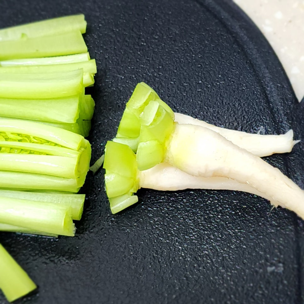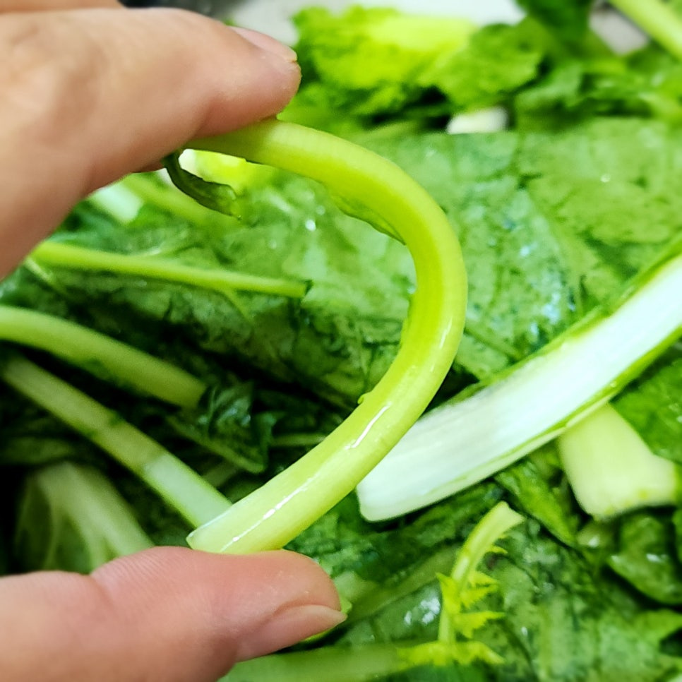 줄기와 이파리 부분은 먹기 좋은 길이로 자르고 누렇게 뜬 잎이나 지저분한 잎은 제거해 줍니다
