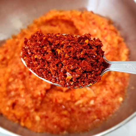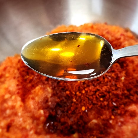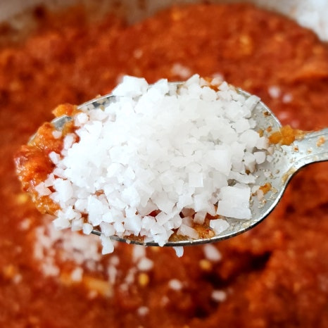 여기에 고춧가루 7 큰술과 까나리액 5 큰술, 천일염 1 큰술을 넣어 골고루 섞어 줍니다