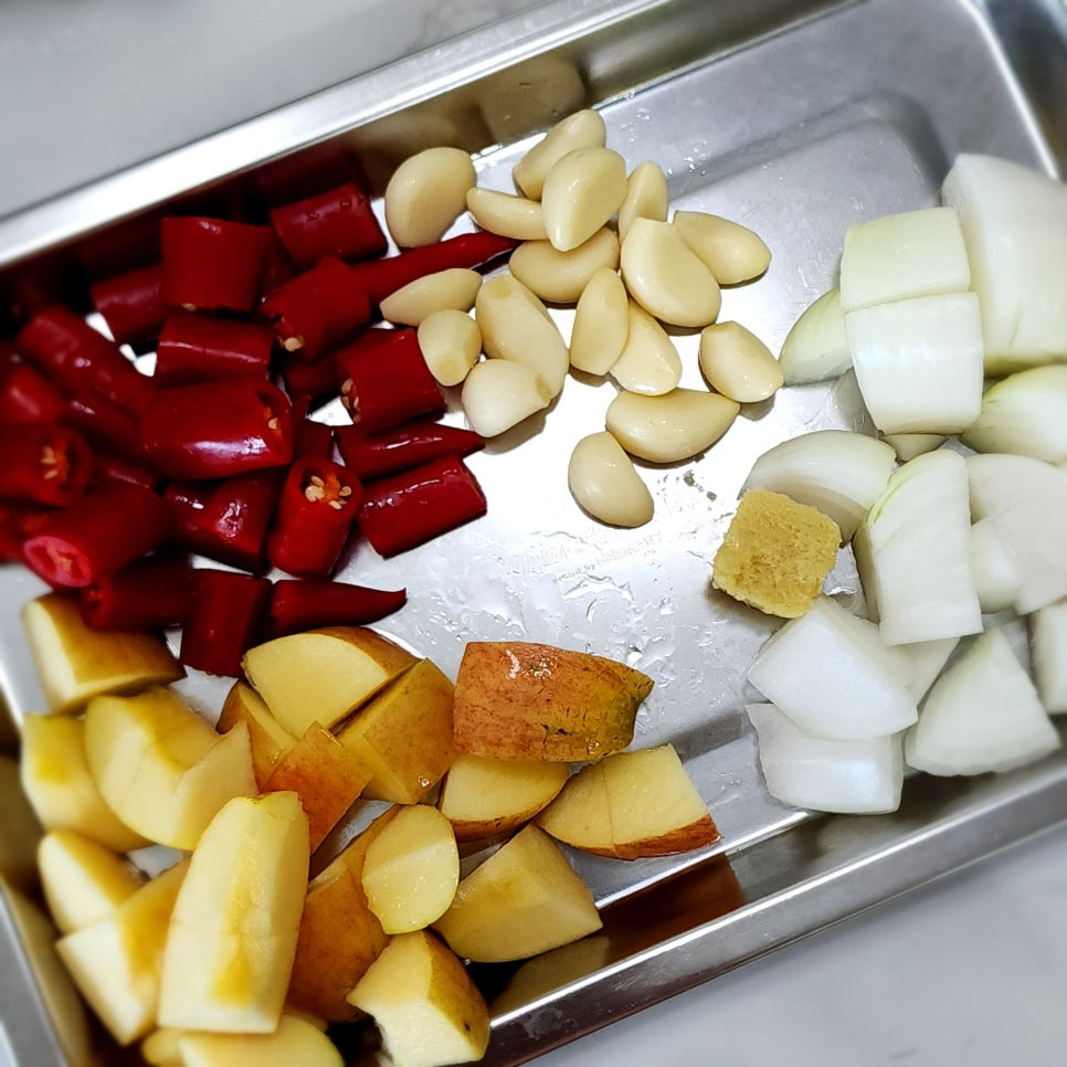 그리고 나머지 재료들은 모두 믹서기에 갈아줄 거라서 작은 크기로 잘라 주시면 된답니다 저는 이번에 배 대신 사과를 넣었는데요 배를 넣으면 시원~한 맛이 좋은 대신 김치에 국물이 좀 많이 생기기에 사과를 넣어 봤답니다 사과 자체의 단맛이 좋아 사과를 넣는 대신 다른 단 맛은 더 넣지 않았답니다