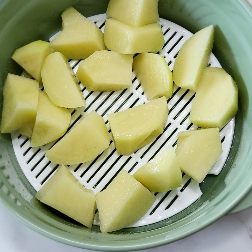 감자는 크기에 따라서 1~2개 정도 찌면 되는데요 저는 제 주먹보다 조금 작은 감자 2개를 작게 잘라서 전자레인지 용기에 담아 쪄 주었답니다