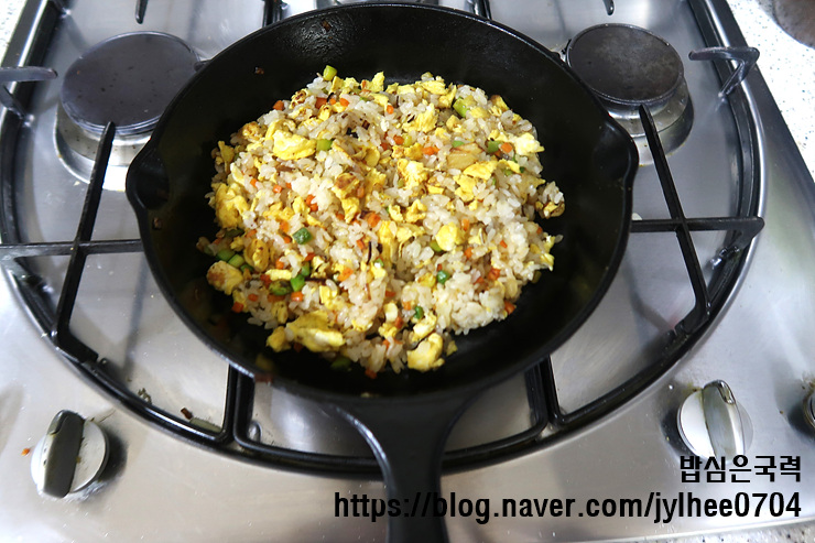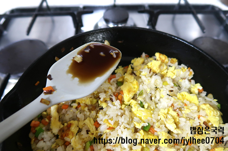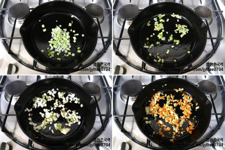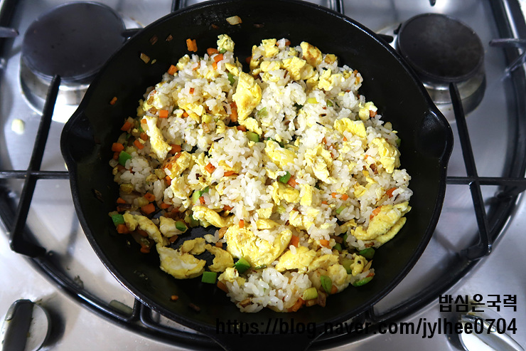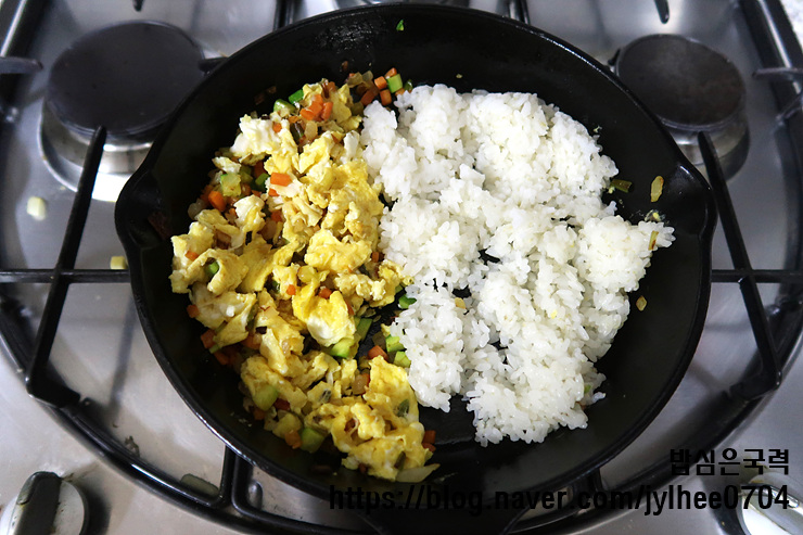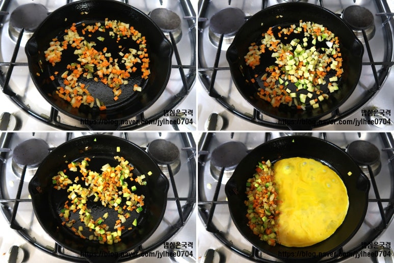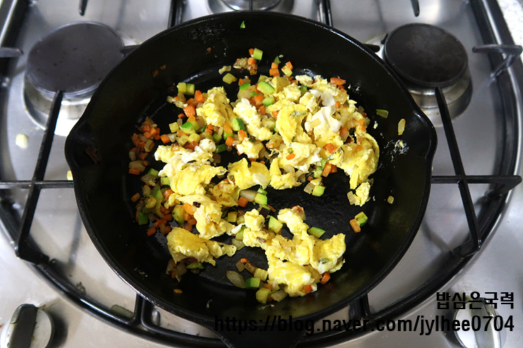 팬 한쪽으로 채소를 밀어두고 달걀을