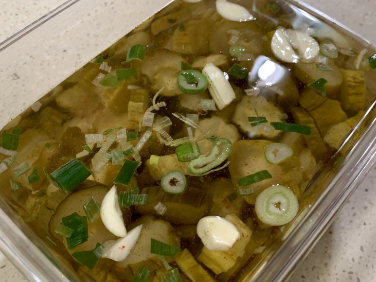 고기를 구워서 이 짠지무침이랑 함께 먹으면 아주 훌륭한 조합이 됩니다.