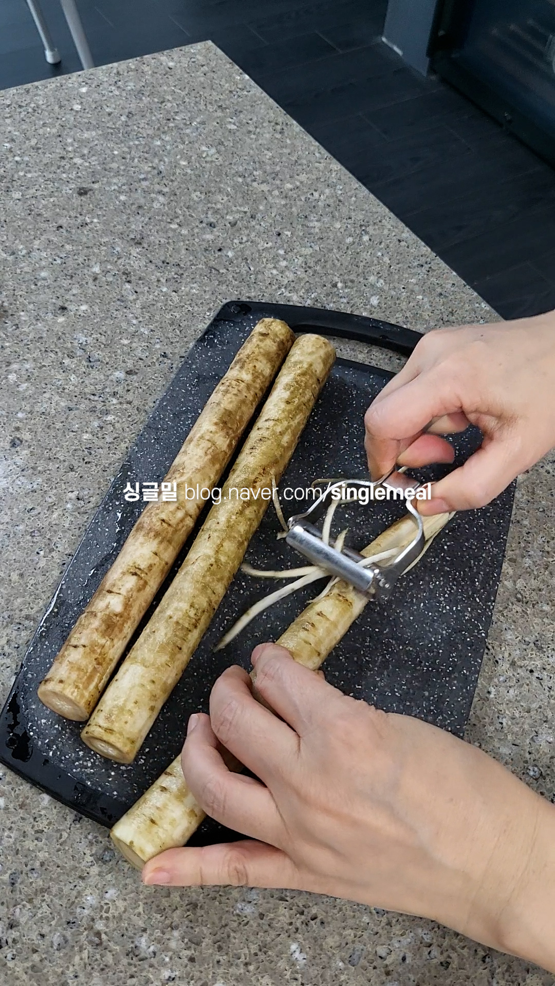 우엉은 껍질을 벗겨 채썰어 주는데 필려나 칼 중 편할 걸 사용하면 된다.