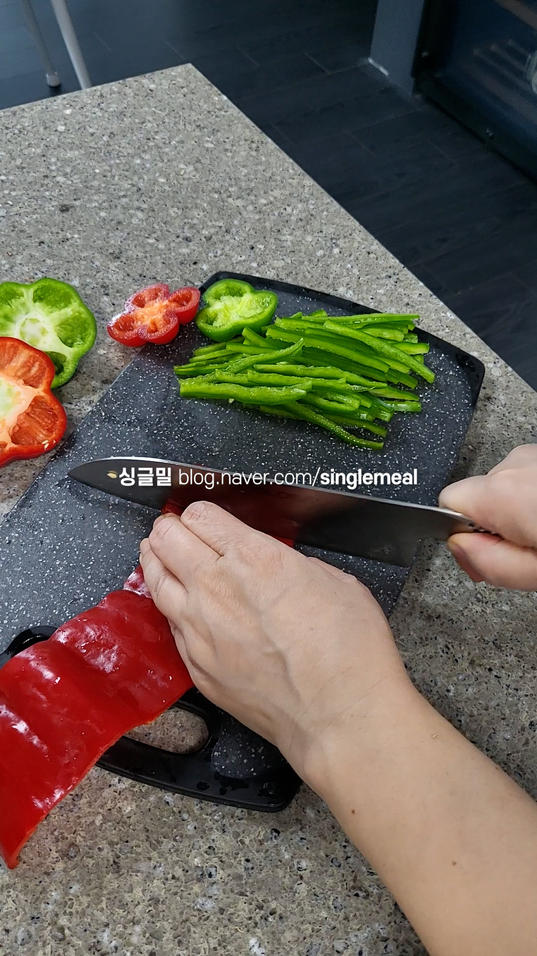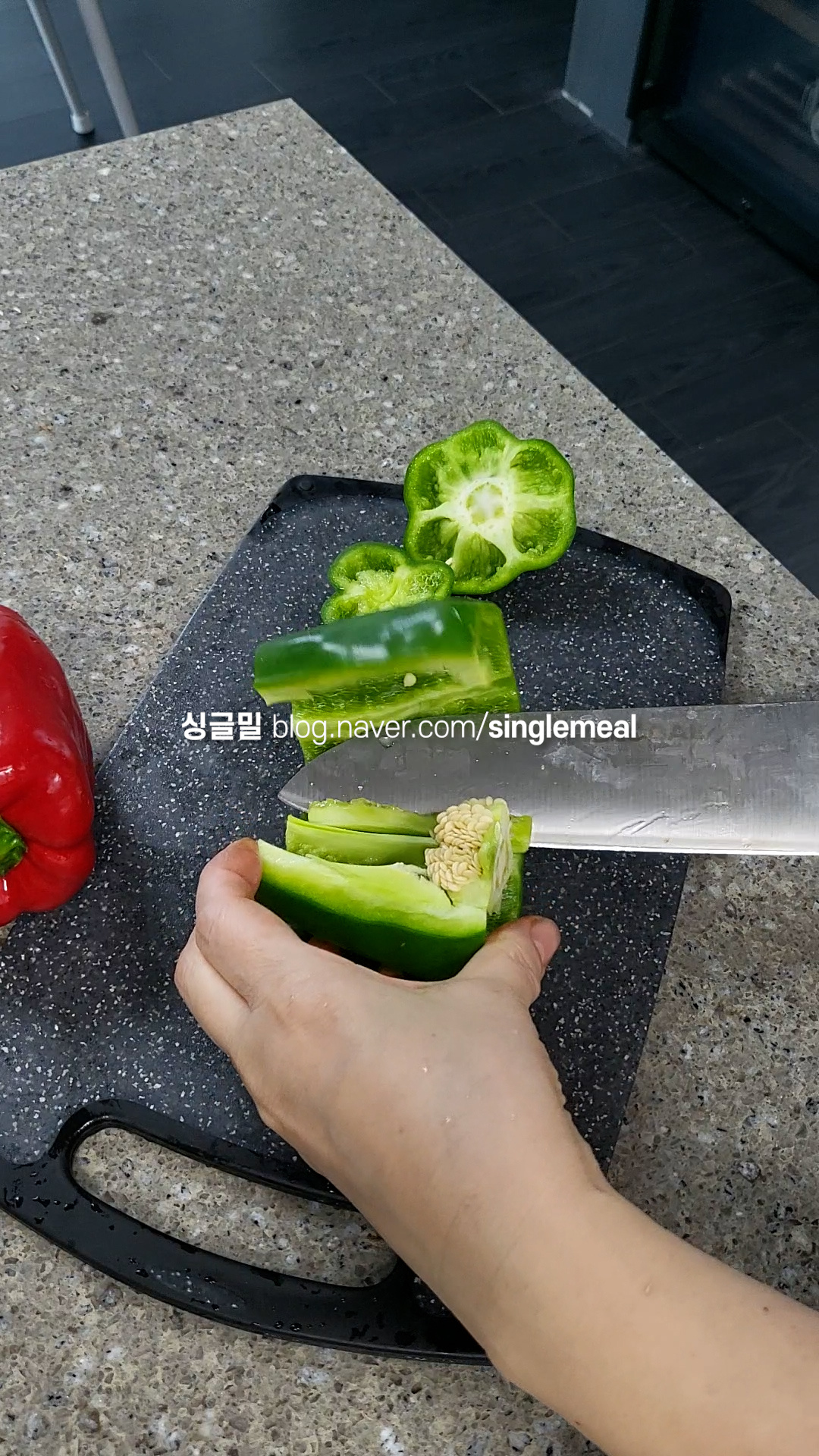 청피망, 홍피망은 아래위를 잘라내고 씨부분을 도려낸 다음 채썬다.