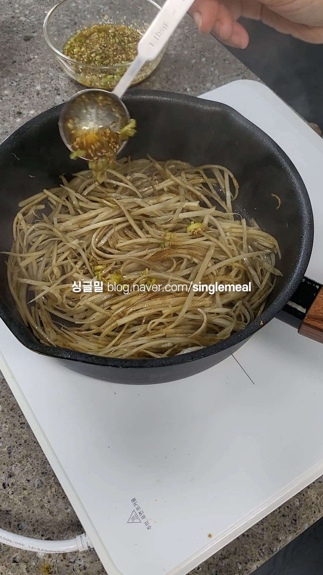 달군 팬에 식용유 두르고 볶으면 되는데, 우엉을 볶을 때만 물을 살짝 넣어서 타지 않게 볶아주고, 양념장도 두어스푼만 넣고 볶아 간이 배게 한다.