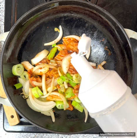양파가 절반쯤 투명해질 때 김치를 넣고