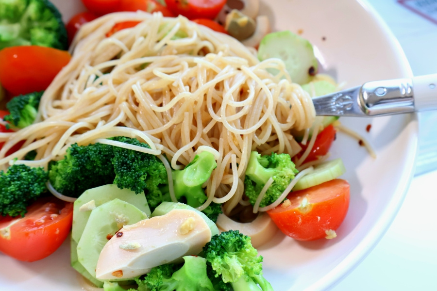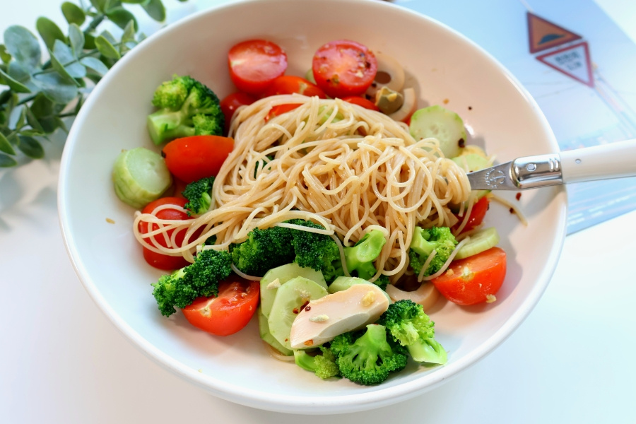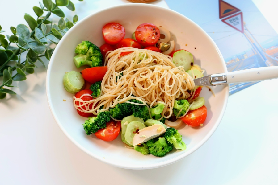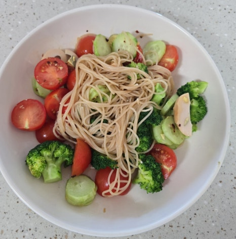 파로면 1인분 방울토마토 4~5알 브로콜리 4~5송이 오이 1/3개 구운 계란 1개 , 선택 : 치즈가루 페퍼론치노 , 간장파스타 양념 : 올리브오일 2 식초 2 진간장 2 알룰로스 1 다진 마늘 0.3 후추 약간 , 계량 : 밥숟가락