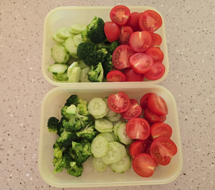 브로콜리는 한 입 크기로 썰고, 오이는 동그랗게 방울토마토는 반으로 잘라 밀폐용기에 소분해 주세요.