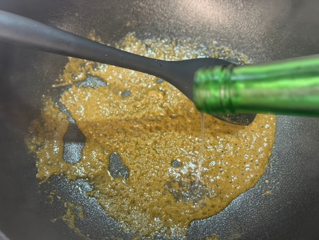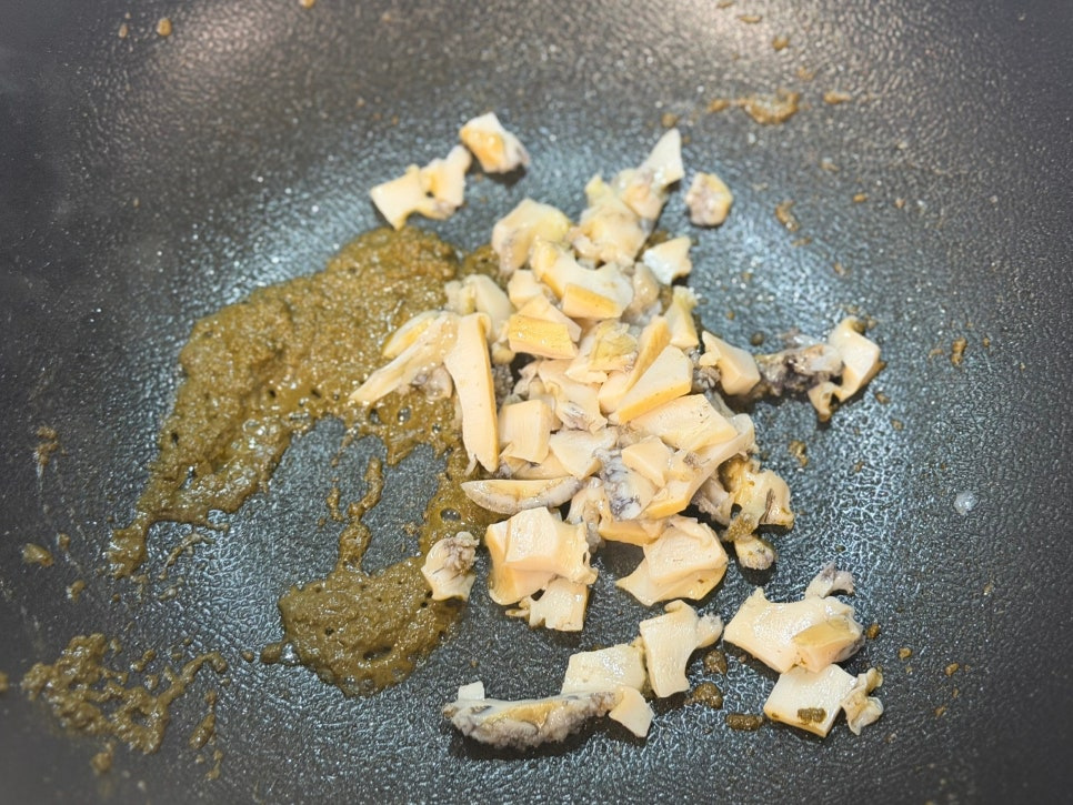 믹서기에 갈아놓은 전복내장을 넣고 볶아요.