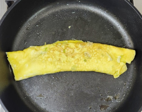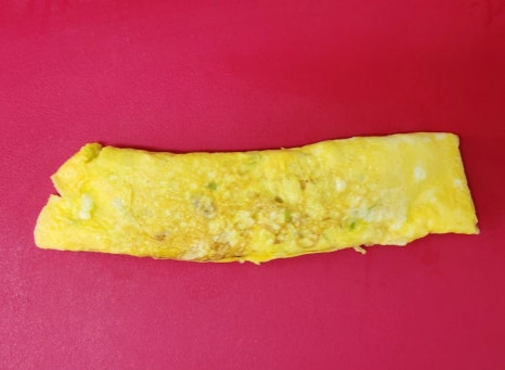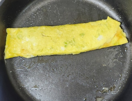 이제 뒤집개를 이용해서 한쪽 끝부터 계란을 천천히 말아주세요. 한 번에 끝까지 말려고 하지 말고, 조금씩 접듯이 말아주는 것이 모양을 예쁘게 만드는 포인트입니다. 그리고 앞뒤로 노릇하게 잘 익혀주세요.