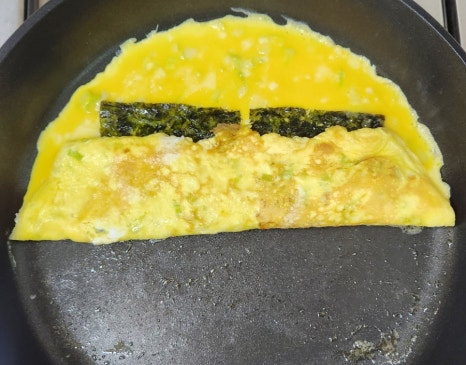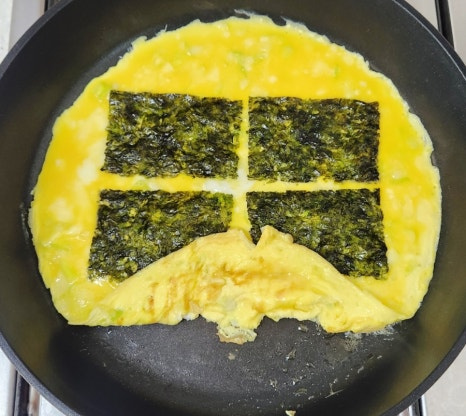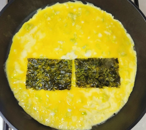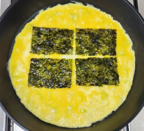 계란이 살짝 익기 시작할 때 그 위에 조미김 4장을 계란물 위에 골고루 올려줍니다.