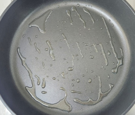 팬에 식용유를 약간 두른 뒤 중불에서 달궈줍니다. 팬이 충분히 달궈지지 않은 상태에서 계란물을 붓게 되면 들러붙을 수 있으니 손을 가까이 대봤을 때 따뜻함이 느껴질 정도까지 예열해 주세요. 팬이 달궈지면 불을 약불로 줄인 뒤 계란물을 모두 부어줍니다.