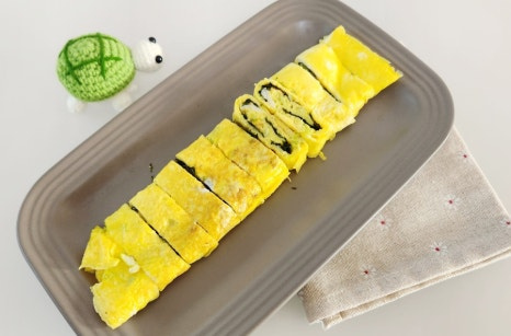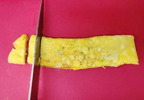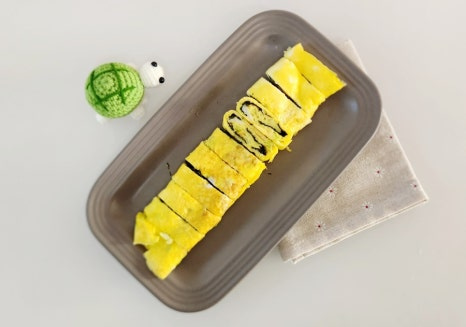 완성된 김계란말이는 팬에서 꺼내 도마 위에 올린 후 한 김 식혀줍니다. 바로 자르면 모양이 흐트러질 수 있으니 살짝 식힌 후 칼로 썰어주세요.