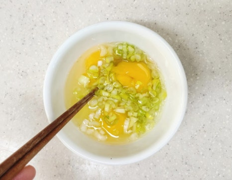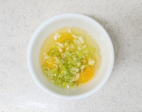 여기에 썰어 놓은 대파를 모두 넣어 주세요. 그리고 부드럽게 잘 풀어 줍니다. 이때 계란 흰자와 노른자가 완전히 섞이도록 저어주는 것이 중요합니다.