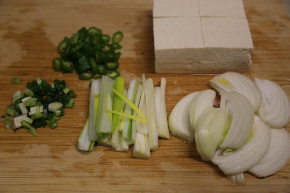 두부 한 모, 대파 1/2대, 양파 1/2개, 쪽파 1대, 청양고추 2개
