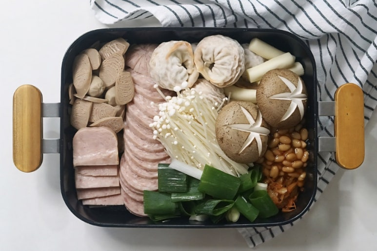 부대찌개에 들어가는 재료를 준비해요. 재료는 정해진 것 없이 냉장고 속 자투리 재료들로 자유롭게 준비해 주시면 돼요. 저는 후랑크소세지, 스팸, 비어슁켄, 대파, 냉동만두, 떡볶이떡, 팽이버섯, 표고버섯, 잘게 자른 신김치, 베이크드빈스 준비했고 4명이 충분히 먹을 수 있는 양입니다.