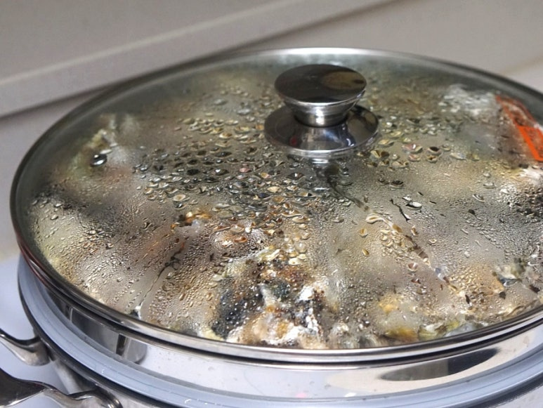 석화 위로 소주 1컵을 뿌리고 물이 끓기 시작한 냄비에 찜기를 올리고 뚜껑 덮어 10분 쪄주세요. 그리고 불을 끈 후 5분 뜸 들여주세요.