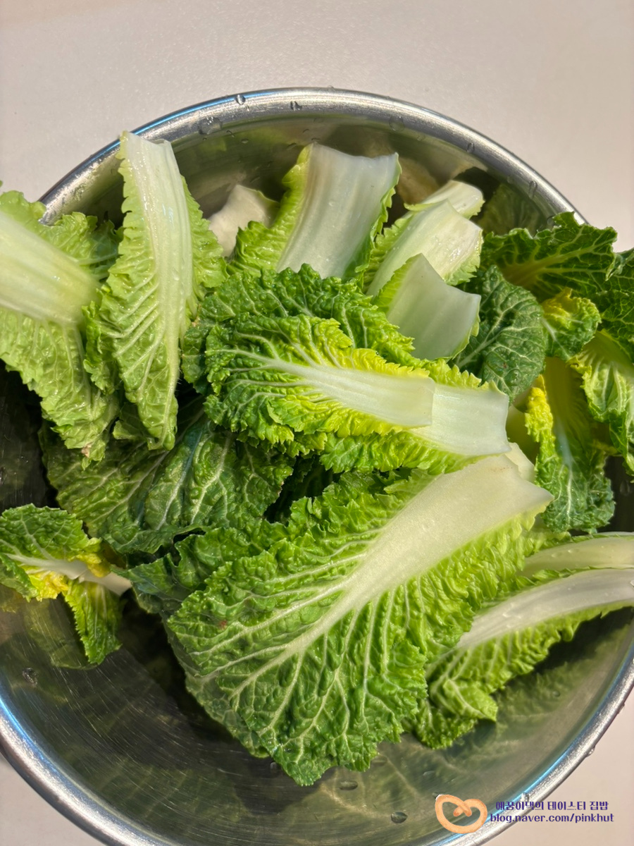 흐르는 물에 줄기와 잎을 문질러가며 세척 후에, 물기를 탈탈 털어주면 봄동 손질 끝이에요.