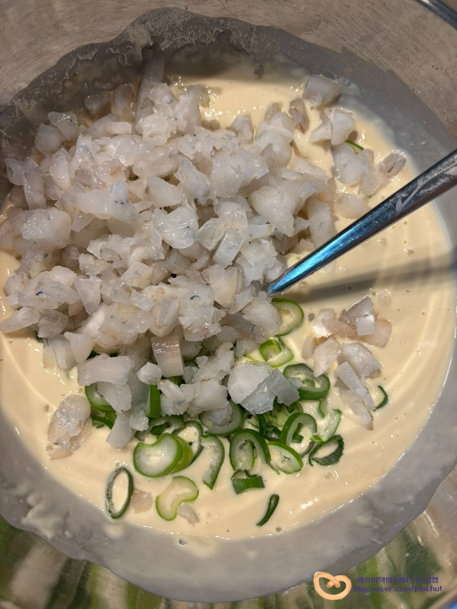 여기에 다져둔 새우살, 대파를 넣고요, 한 번 더 골고루 섞어서 부침개 반죽을 완성해 주었어요