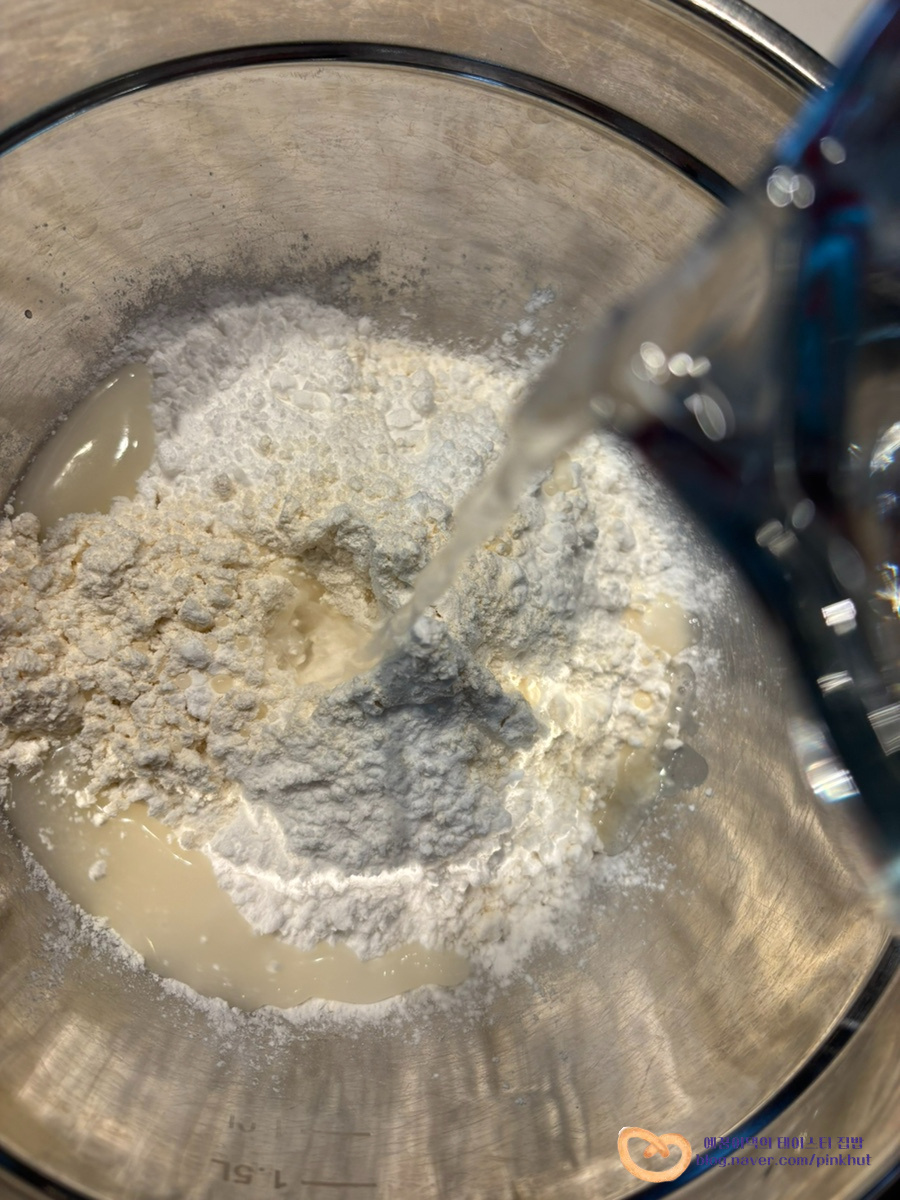 부침가루, 전분가루 섞은 양과 물의 양이 약 1:1 비율로 들어가는데요. 요거트 정도의 농도로 맞워주는 것이 포인트!