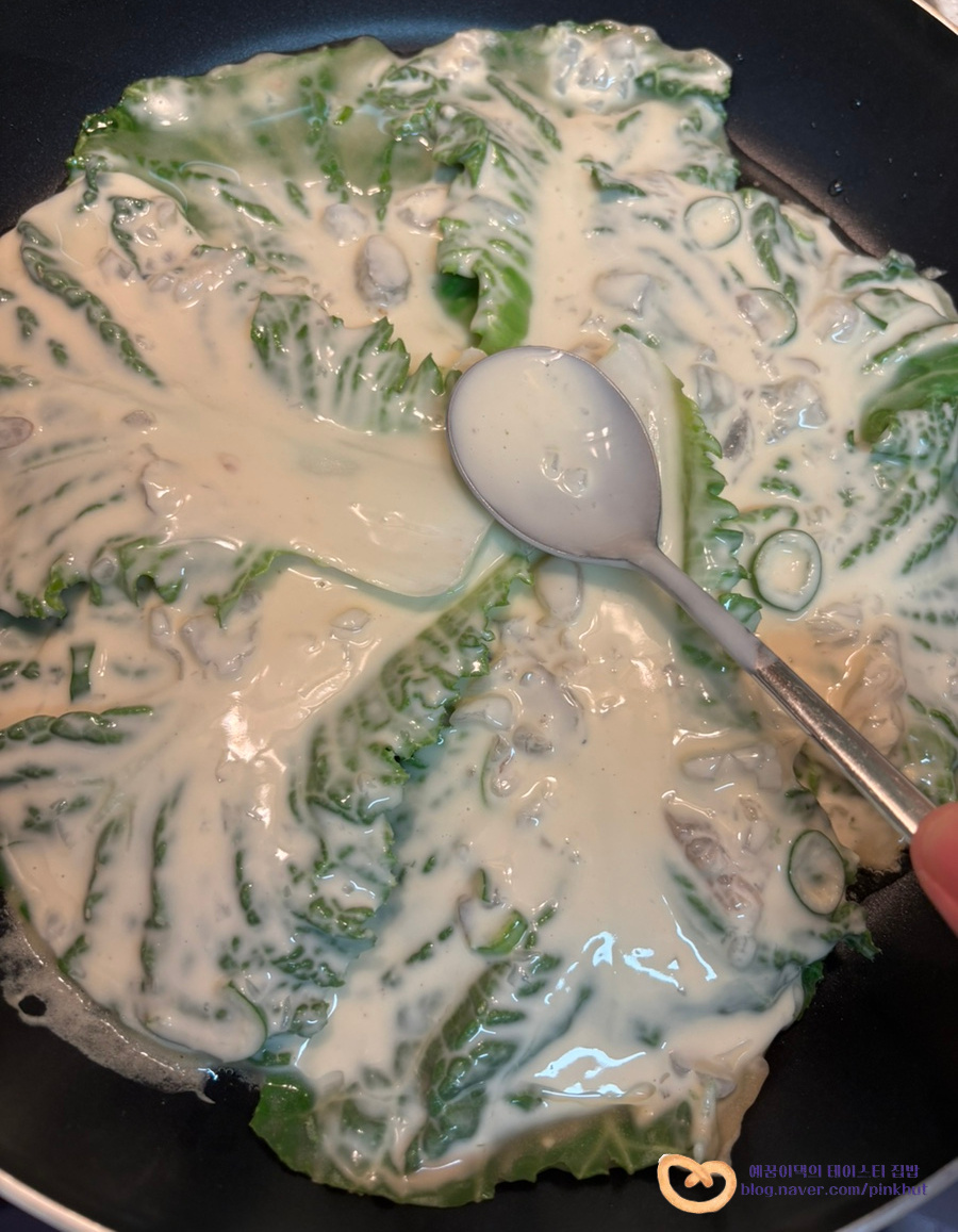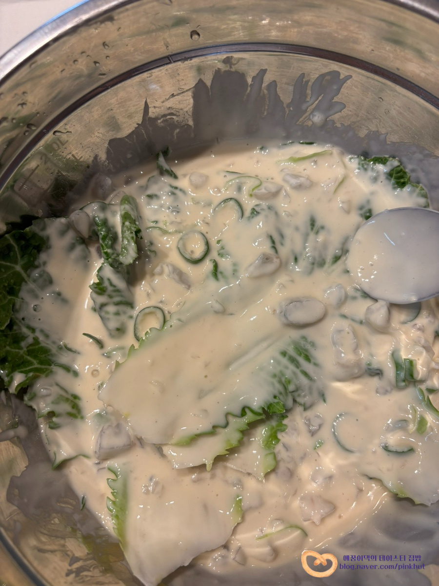 이제 봄동을 넣고, 반죽옷을 입혀주세요.