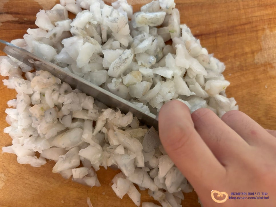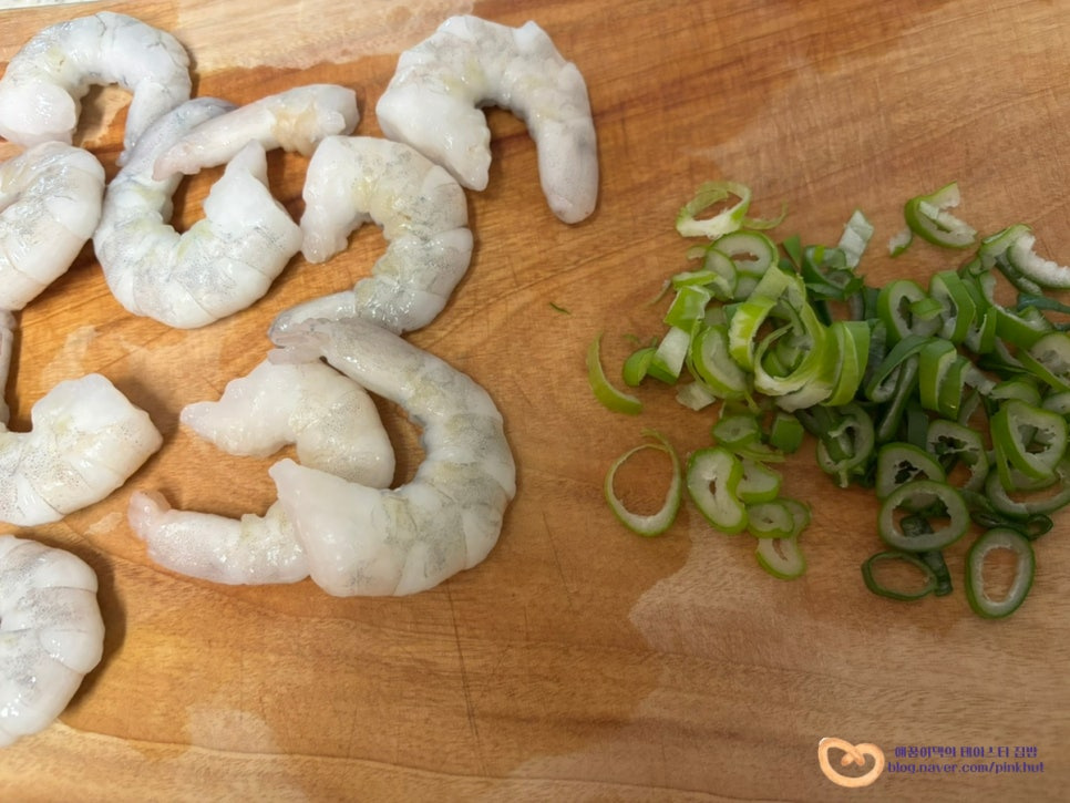 대파 1/2대는 송송 썰고, 냉동새우는 큰 사이즈로 12마리 준비했어요.