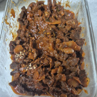 올리고당 없어 갱엿넣었어요. 고기 냄새 싫어해서 데쳐서 만들었어요. 열무김치 넣고 밥에 먹었는데 딴반찬 필요없는 듯해요.