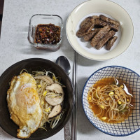 요 레시피에 소고기다짐육 추가했어요! 양념장 맛있어요! 레시피대로 하면 양이 꽤 나와서 2-3인가족은 반이나 2/3정도 양만 해도 될거 같아요. 콩나물 따로 삶으니 아삭아삭해서 좋은데, 귀찮기도 하고ㅋㅋ 식혀서 밥이랑 비빌때 콩나물이 따로 노는 경향이 있어서 나중엔 좀 굵은 콩나물을 밥을 지을때 같이 넣어보아도 좋을거 같아요!