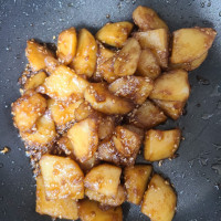 감자전분끼 뺀후 간장2.5 올리고당1,설탕1 에 10분절여서 절인물 버리지않고 식용유 1넣고 볶다 감자반 익음 양파,다진마늘 반스푼넣어 볶다가 참기름1 깨 적당히넣고 살짝볶다마무리