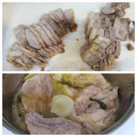 처음에는 두껍게 썰어 먹었는데 다른 후기처럼 맛있게 느껴지지 않아 뭐가 잘못된거지?했는데 얇게 썰어 먹으니 마치 다른 음식 같이 맛있었어요 얇게 썰은 수육을 야채에서 우러난 육수에 넣고 약불로 15분정도 뎁혀 먹어도 맛있었어요