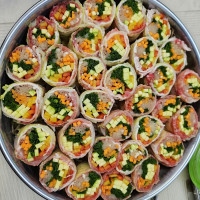 도마에 배추 한 장, 소고기 한 장을 깔고 채 썰어둔 재료를 올린 다음 돌돌 말아요.