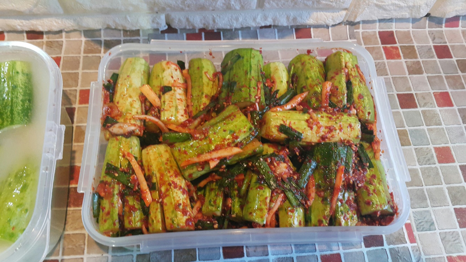 뜨거운물에 오이 퐁당 시켰다 빼서 하면 다 먹을때까지 무르지 않구 아삭거린다우....ㅎ