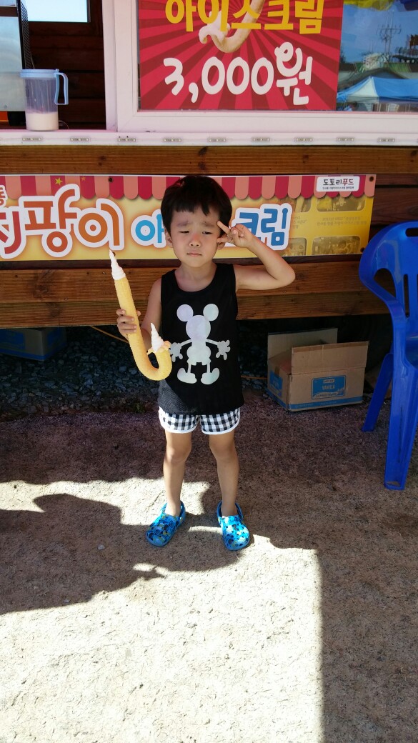 아이스크림.아저씨에게 "하나주세요"라고시켰더니...못해서..뭐라했더니표정이 안좋네...그래도 브이는했네요..