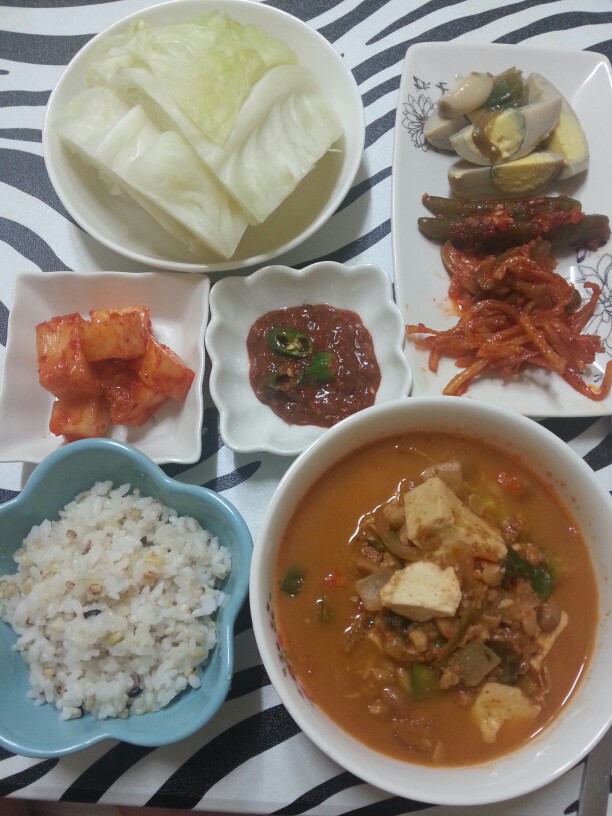 아무것도 하기싫어서 외할머니가 보내주신 얼려둔 청국장꺼내서 찌개만 끓이고 양배추만쪄서 갈치속젓에다 쌈사먹었네요~