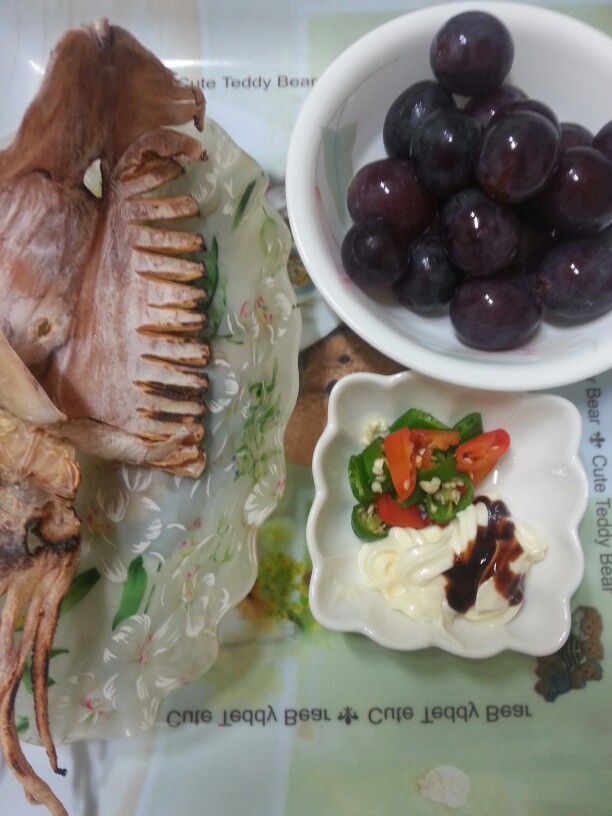 나의 주전부리 오징어와 청양고추마요~난 항상 마요네즈에 청양이넣어서ㅋㅋ 아까 마트에서 타임세일로 득템한 거봉이예요^^