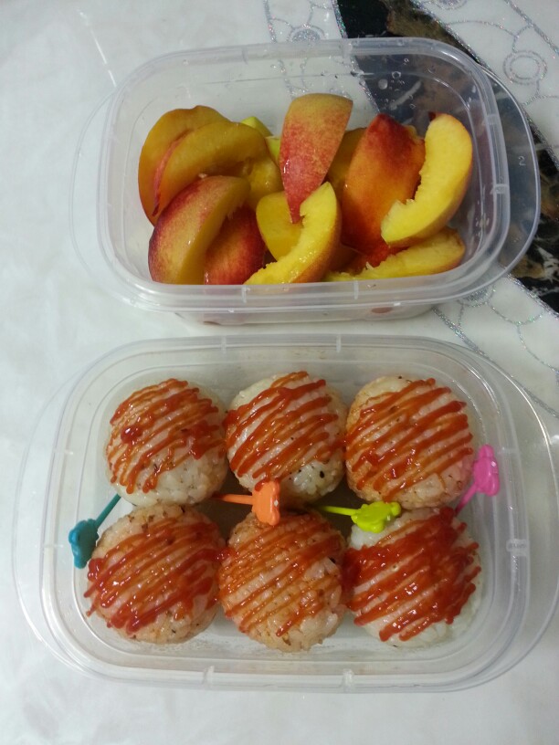 주먹밥에 케챱 이쁘게도 뿌리션네여