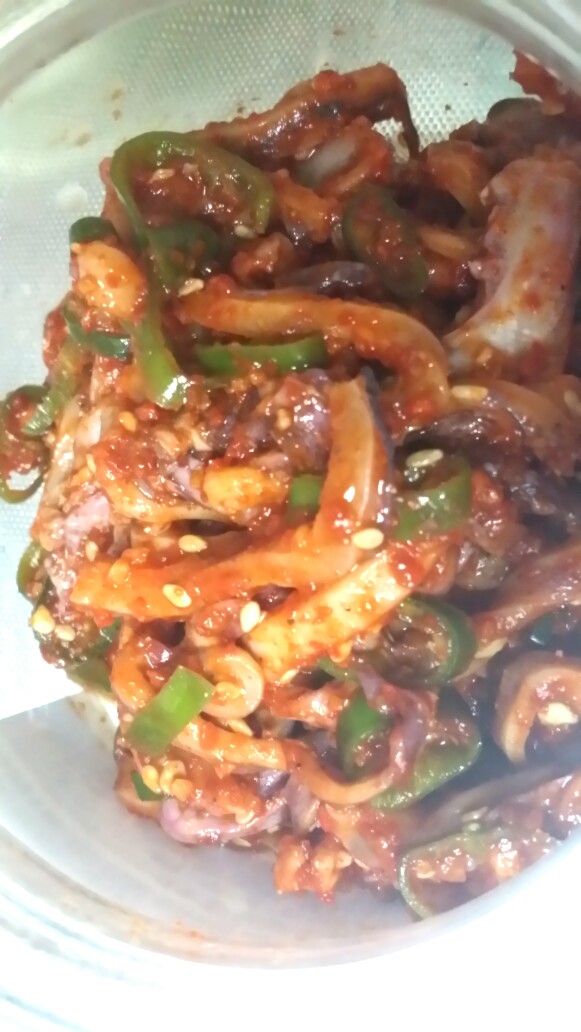 절근오징어는 소금에 염장한거예요~ 그거를 물에 어느정도~소금기빼고 완전꾹짜서 무치는거예요ㅋㅋ 할매가 이북사람이예요