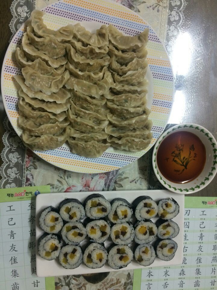 오늘 저녁은 아침에 김밥싸고 남은 단무지와 우엉으로 둘둘말고 아드님께서 만두가 먹고 싶다해서 갈비만두 사다가 저녁 먹어용~~다들 즐저금 되세용~~^^♡