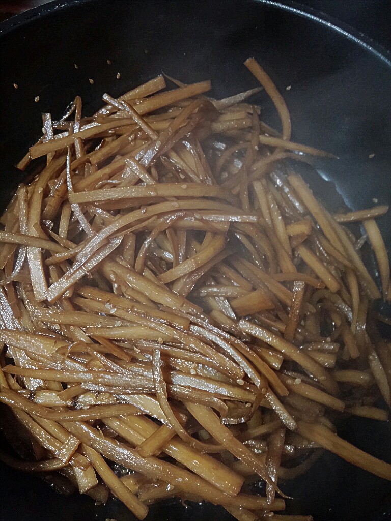우엉 삶아서 물을 쪼금만 냄겨두고 진간장에 참기름약간 깨소금 넣구요 저는 물엿을넣으면향이 좀아니라 흙설탕 넣어서 조렸어요 ㅋ그게끝용ㅋ