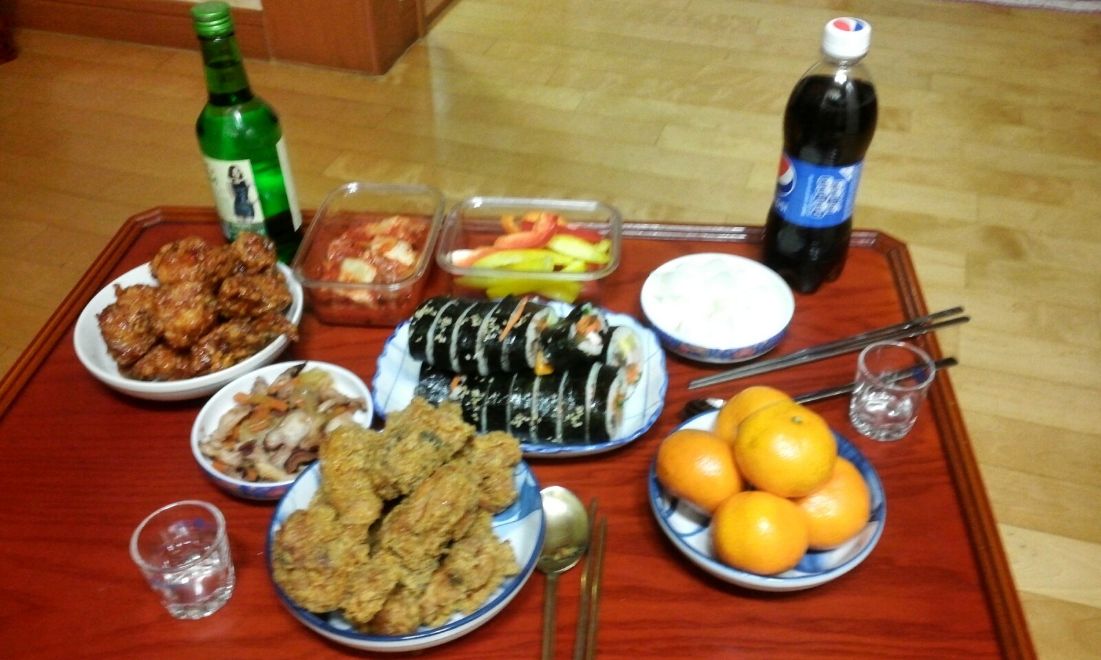 치킨에김밥까정~술상넘푸짐하네여 맛나게드세여~~~^^