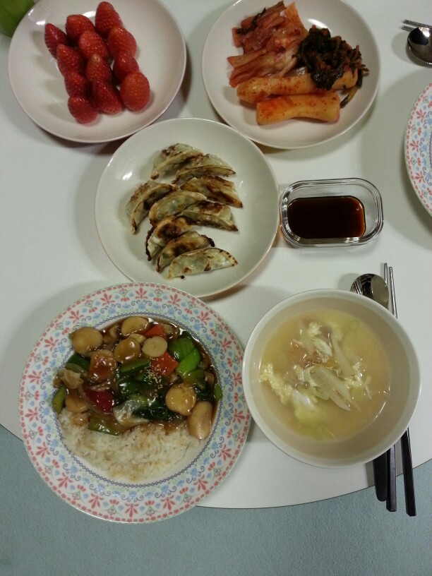 버섯,청경채,피망,양파등등 이것저것 팍팍 넣어서 덮밥 해 먹었네용~ 소박한 저의 저녁밥상 입니다. 득템한 딸기와 만듀를 꾸벗는데 딴짓하다가 태워 버렸어요. 울 신랑님이 탄거먹지 말라고 해서 저는 안 먹고 다 양보 했다지요 ㅋ난 젊으니 더 살아야 하니까!ㅎㅎ절 째려보던 신랑님! 메렁 ~ 가족들과 둘러 앉아서 즐거운 저녁 드세욤