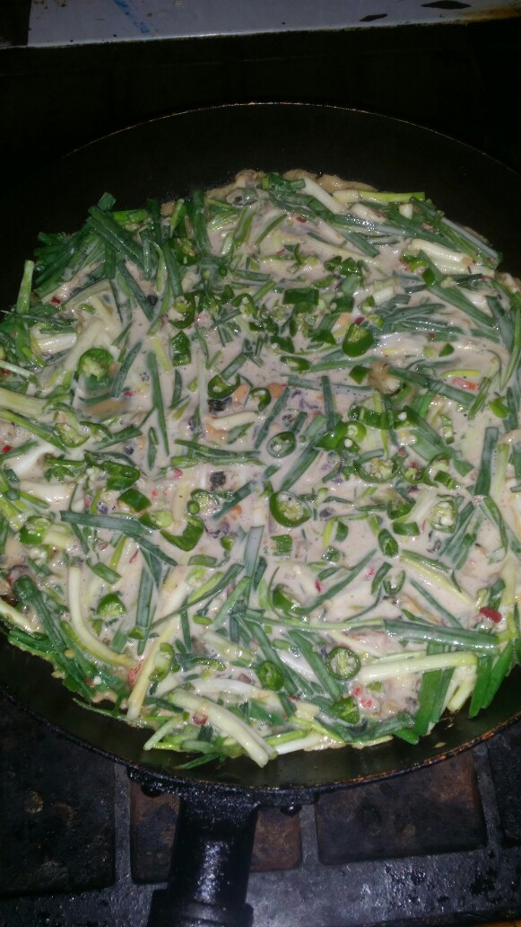 ㅎㅎ 정구지 쪽파 굴 홍합 땡초 다져넣고 막걸 한잔해요~~~^^맵삭하니 굿~~^^