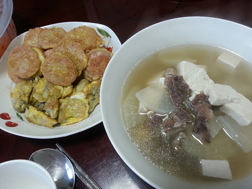 굴전 소세지구이 소고기뭇국!!!진짜로 내가 다 좋아하는건데~~국에 고추가루없는거 좋아해여~~^^