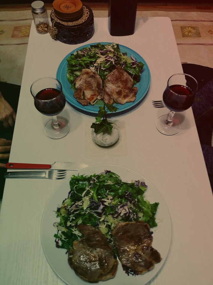 만개님들 반갑습니다!! ^^ 매일 눈팅만 하다가 용기 냅니다!! 49세 2녀 1남 아이들의 엄마예요. 님들이 너무 솜씨가 좋아서 살짝 기가죽네요!! 용기내서 올립니다. 아들이 좋아하는 목살 스테이크와 신랑이랑 포도주 한 잔 했습니다. 많이 배우고 있습니다. ~^^