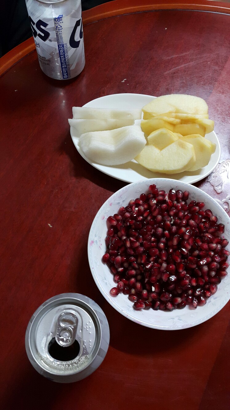 낮에 꼬치전,어묵전,동태전,호박전,새송이버섯전,다인오징어고추전,표고버섯전 부쳐서먹고 저녁에는 삼겹과 오리고기 먹고 입가심으로 카스캔과 배,사과,석류 먹어용~^^
